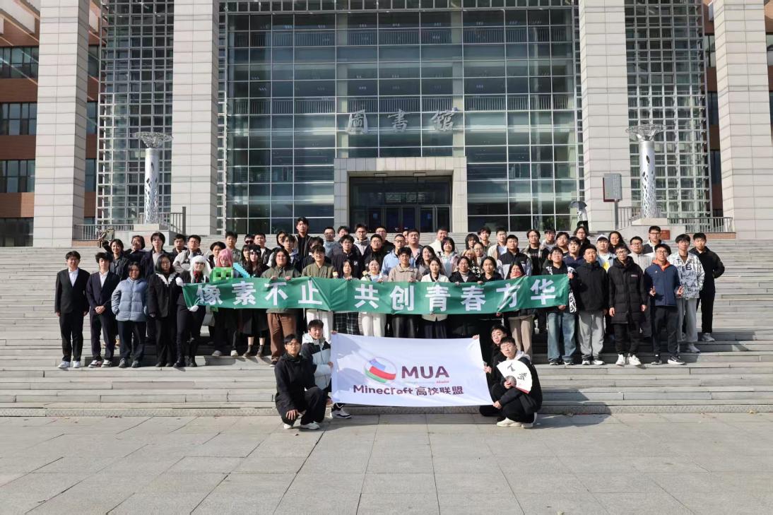 最后,全体参会人员有序前往四象城图书馆正门合影留念。大家手持印有MUA Minecraft高校联盟标志与“像素不止,共创青春芳华”口号的旗帜,在镜头前绽放笑容,定格下这一连接热爱、凝聚力量的瞬间。